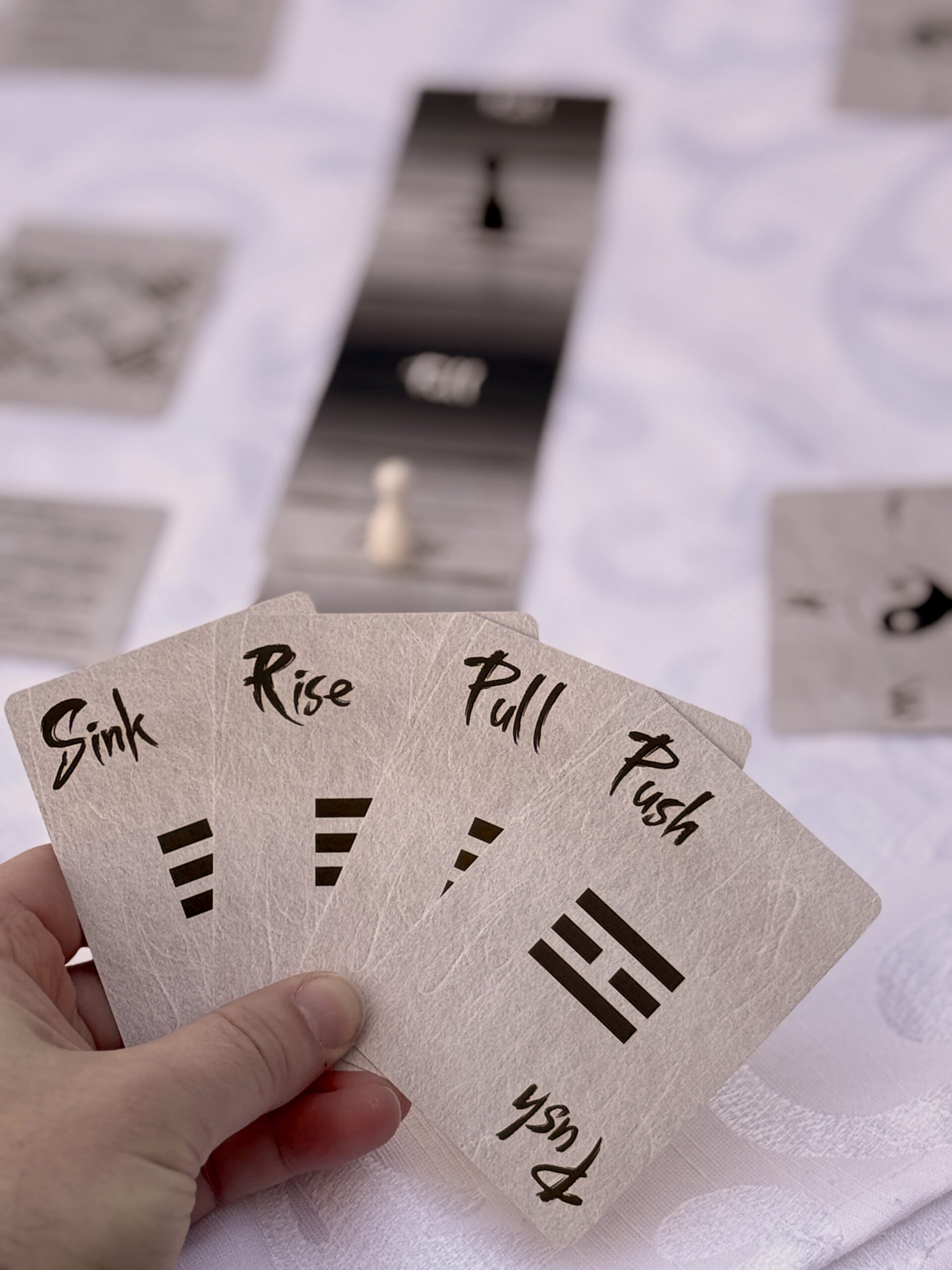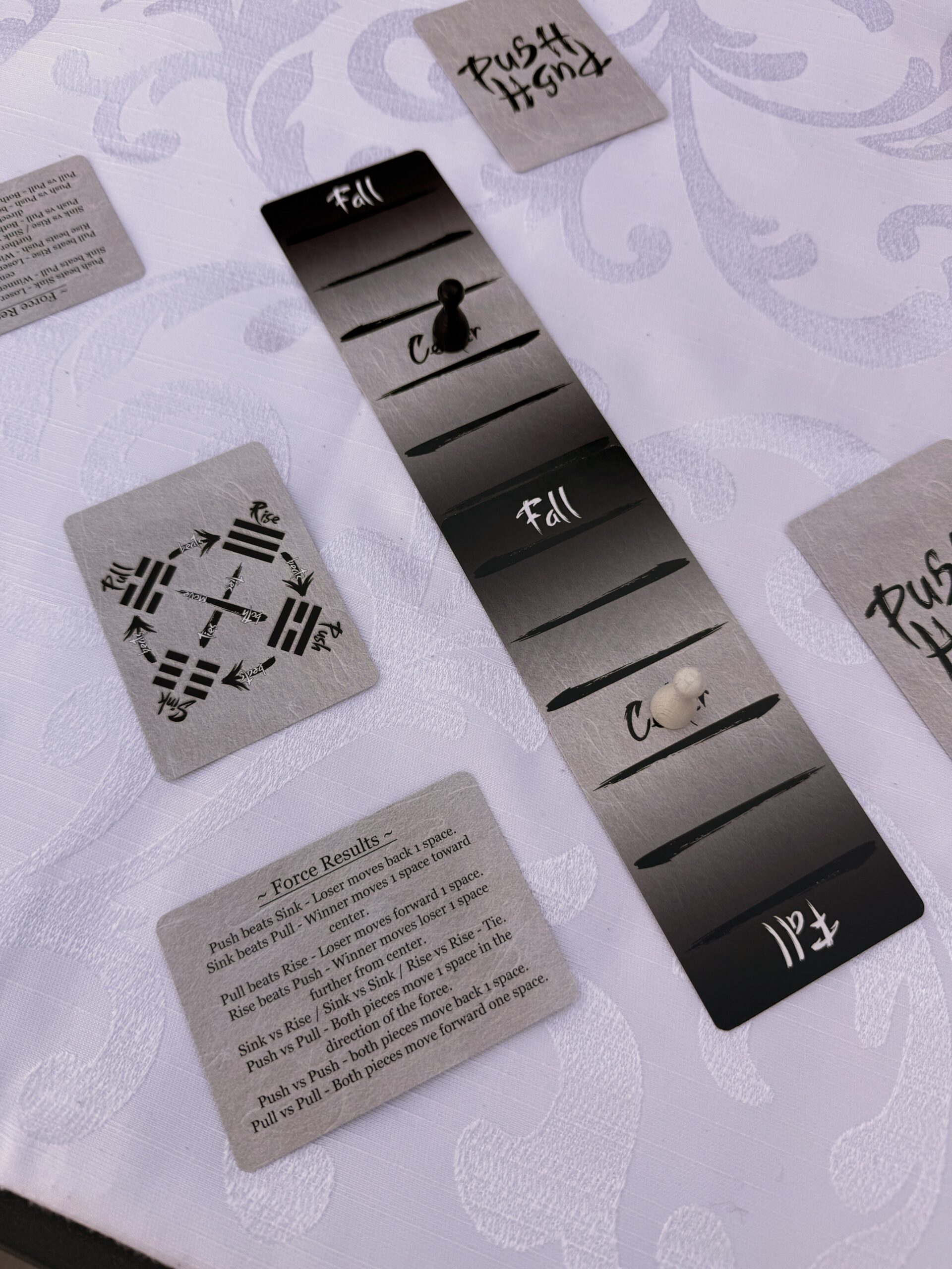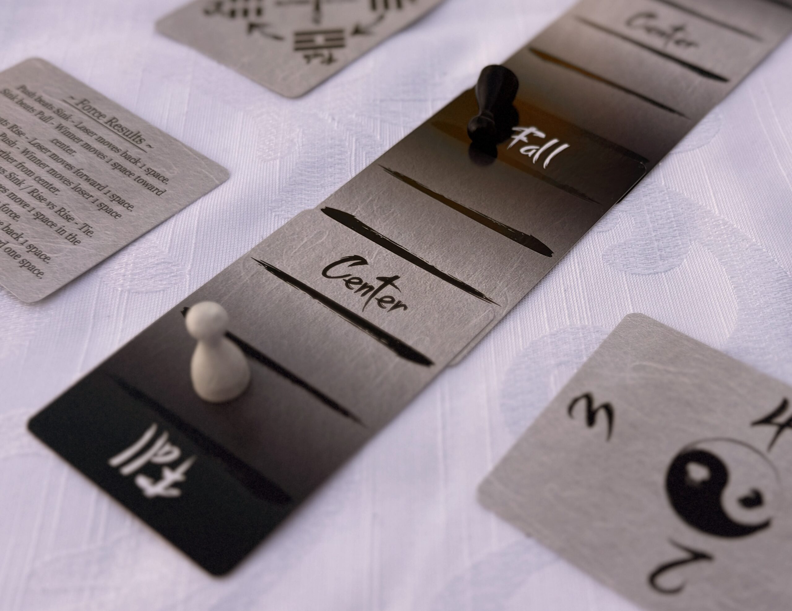 2 Players - Based on the Tai Chi practice of the same name, knock your partner off balance while maintaining your own center. You have 4 forces to apply and must decide each turn which one to play against the force played by the other side.